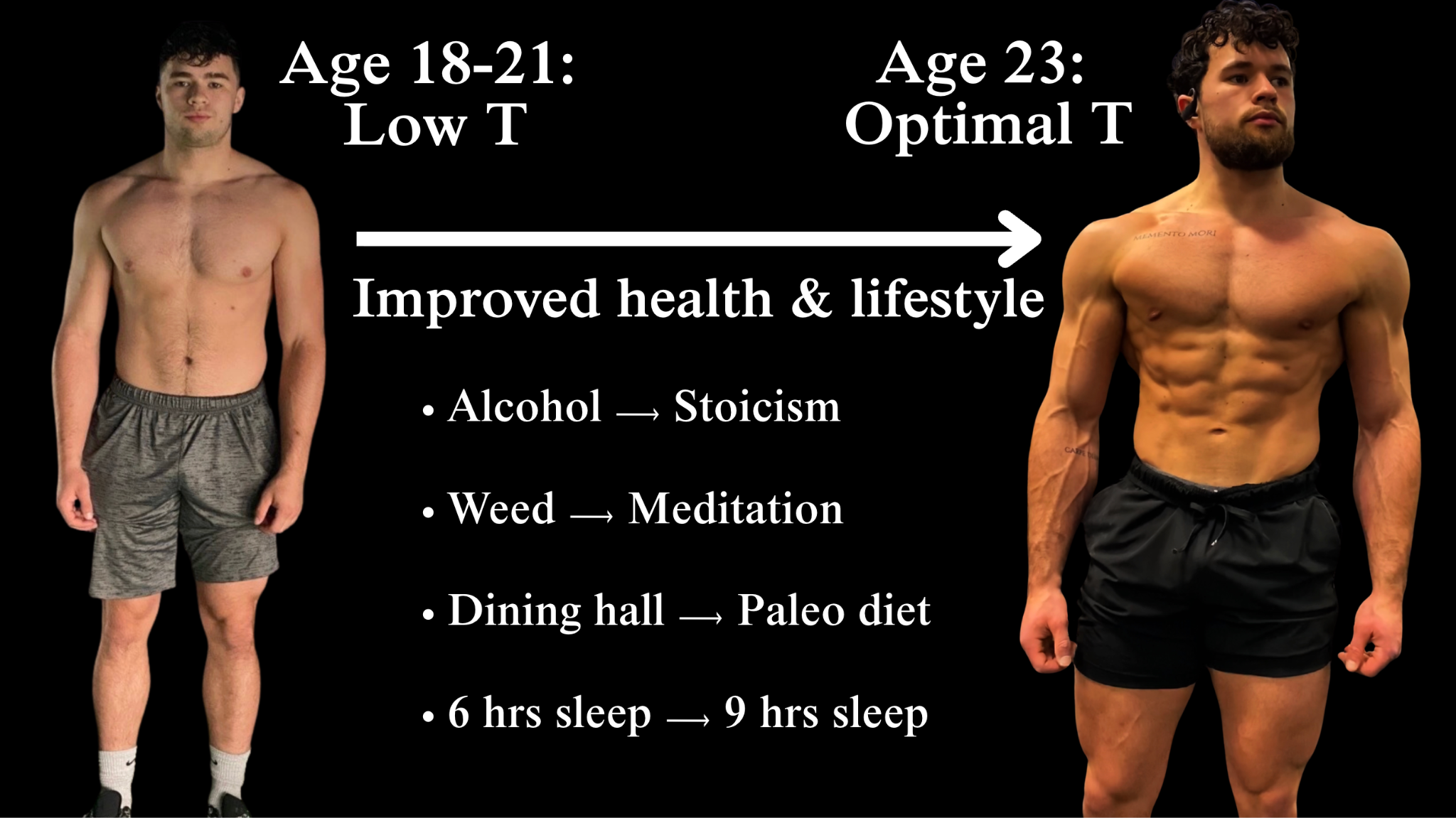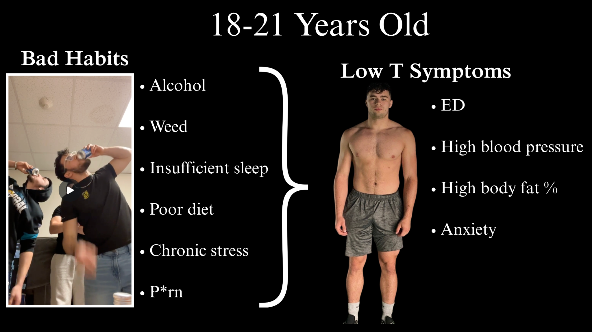 At the ripe young age of 18-21, when my testosterone levels should have been at their peak, I grappled with low testosterone because I was riddled with unhealthy habits that bled me of my vitality.