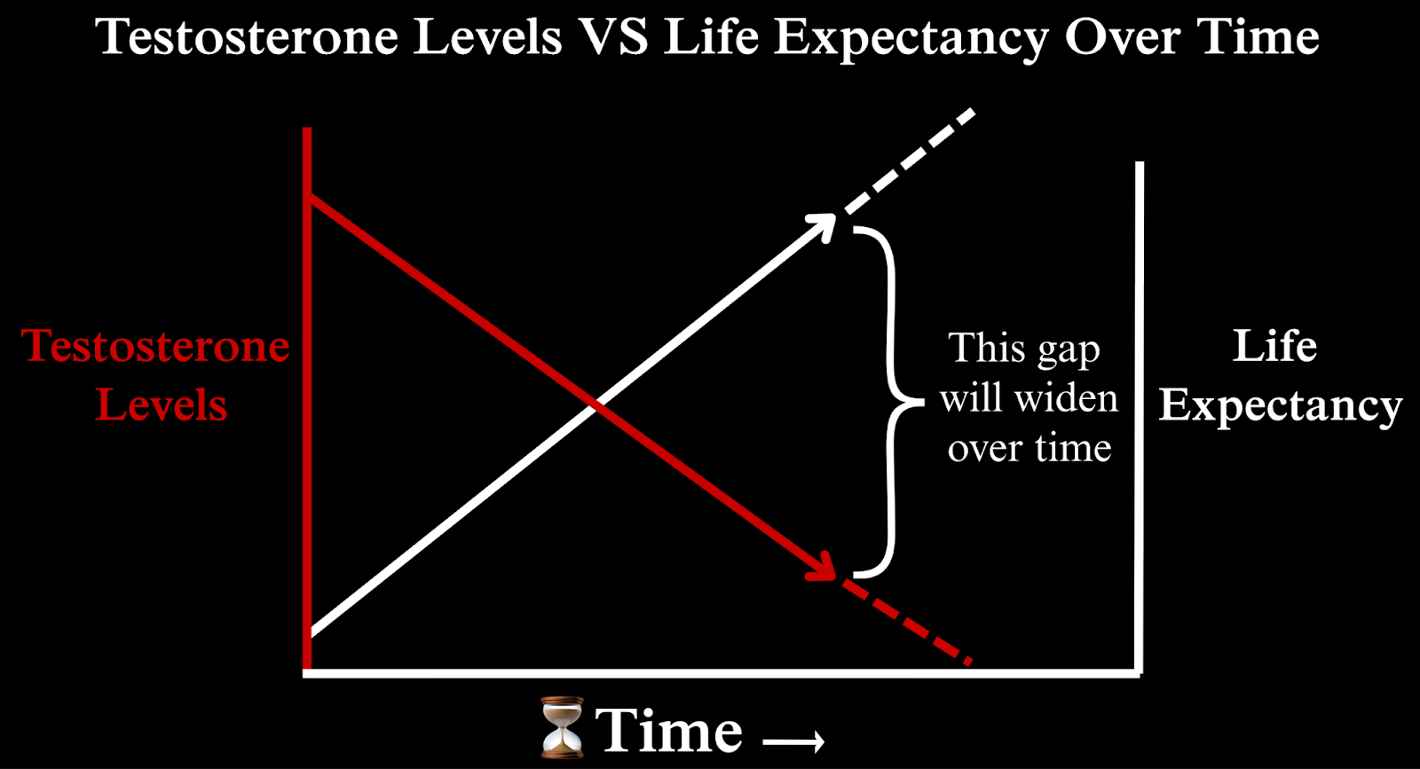 Because testosterone levels are a barometer of health, the inverse correlation between lifespan and testosterone levels indicates that although our lifespan is increasing (that is, we are living longer), our healthspan is not.