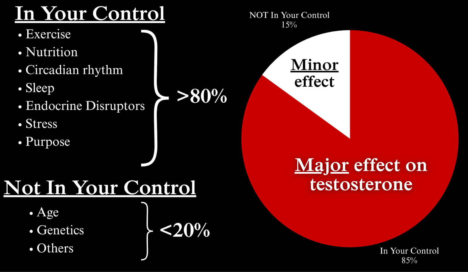Notably, the factors within your control have an outsized effect on your testosterone levels, in contrast to the forces outside of your control (including your age), which have a minor effect by comparison, highlighting the importance of having an internal locus of control.