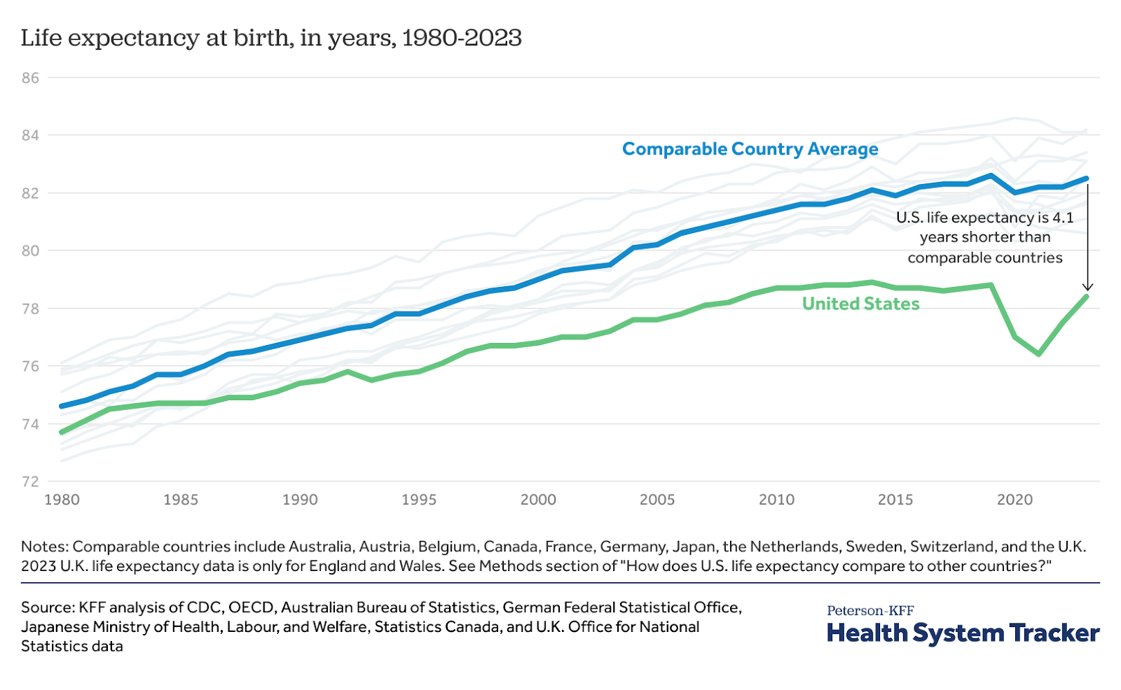 - Rakshit, S., & McGough, M. (2025, January 31). How does U.S. life expectancy compare to other countries? Peterson-KFF Health System Tracker. https://www.healthsystemtracker.org/chart-collection/u-s-life-expectancy-compare-countries/#Life%20expectancy%20at%20birth,%20in%20years,%201980-2023