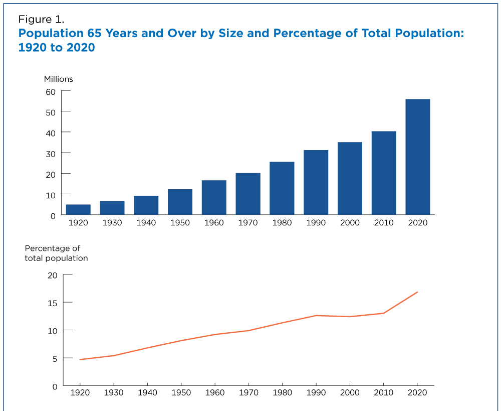 After growing five times faster than the total population between 1920-2020, the percentage of the U.S. population aged 65 and older reached an all time high of nearly 17% in 2020 (2).