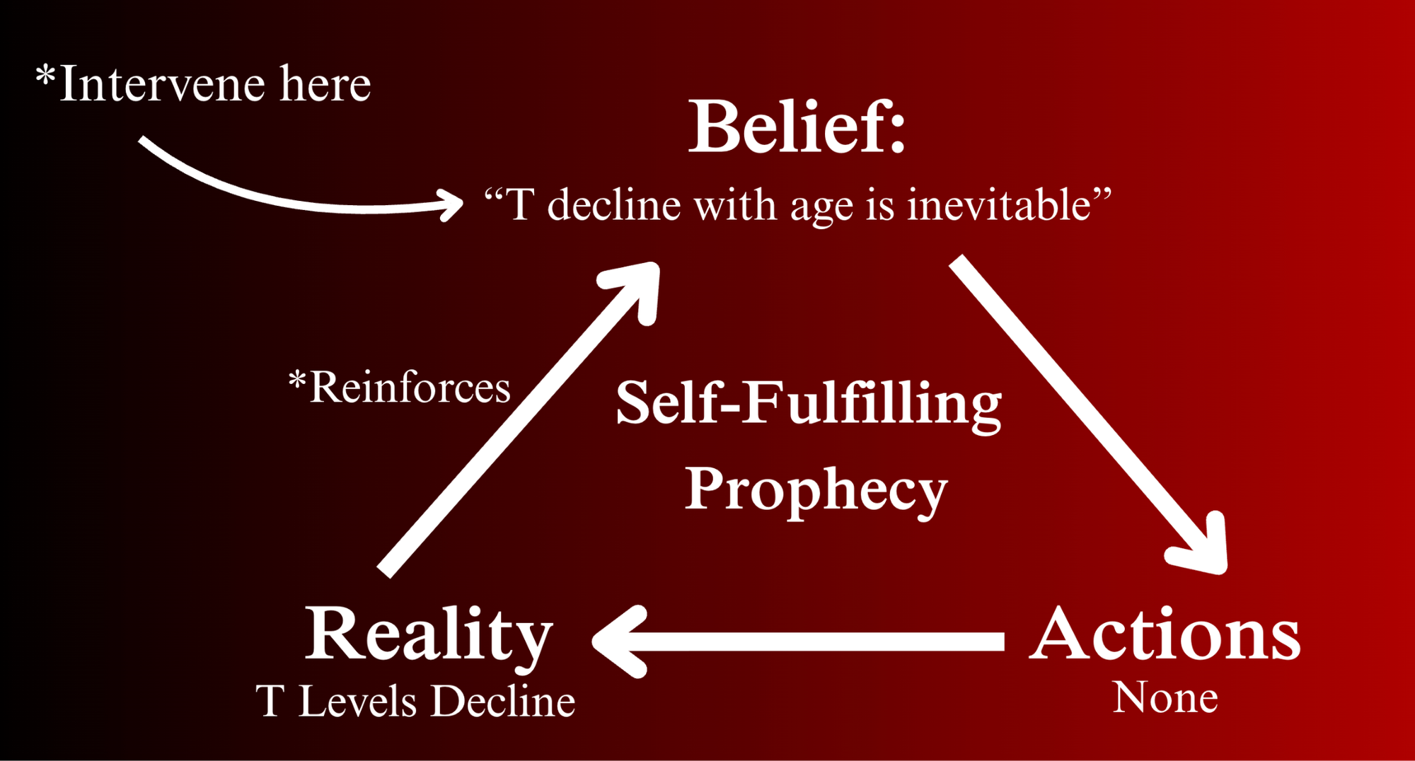 This dual effect caused by the belief that testosterone declines with age creates a self-fulfilling prophecy that makes it come true. Here's how...