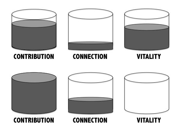 The person in the first row is putting plenty of energy into their purpose (contribution) and health (vitality), but they don't have much left in the tank for nurturing their relationships.
