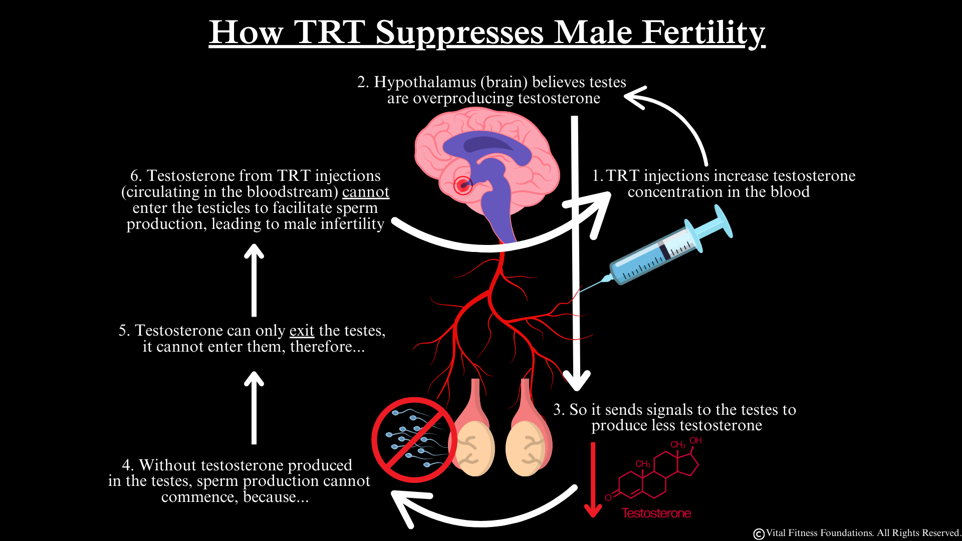 Since TRT causes the body to stop producing endogenous testosterone, and cannot facilitate sperm production itself, TRT use leads to the cessation of sperm production, and as a result, male infertility.