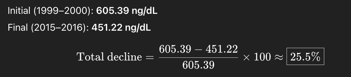 The researchers found that average testosterone fell from 605.39 ng/dL in 1999–2000 to 451.22 ng/dL in 2016 (p < 0.001), a 25.5% decrease.