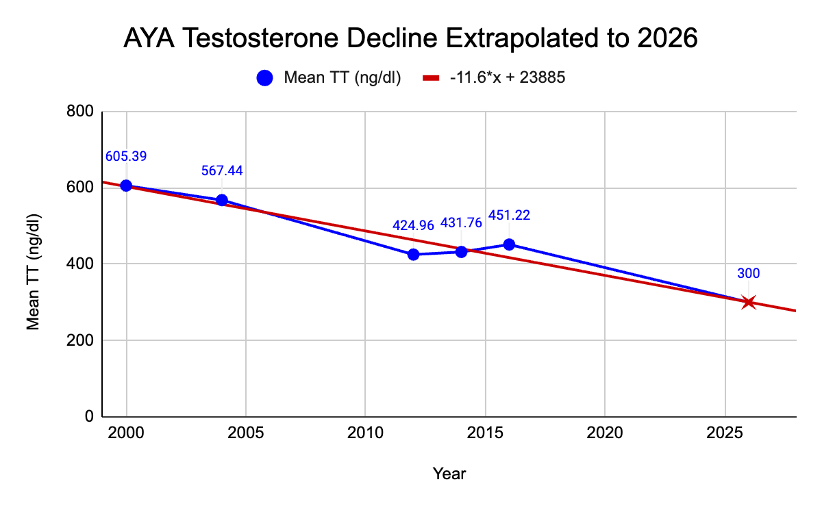 If testosterone levels continued to fall at that rate, the population average would reach the clinical threshold for low testosterone (300 ng/dL) by 2026.
