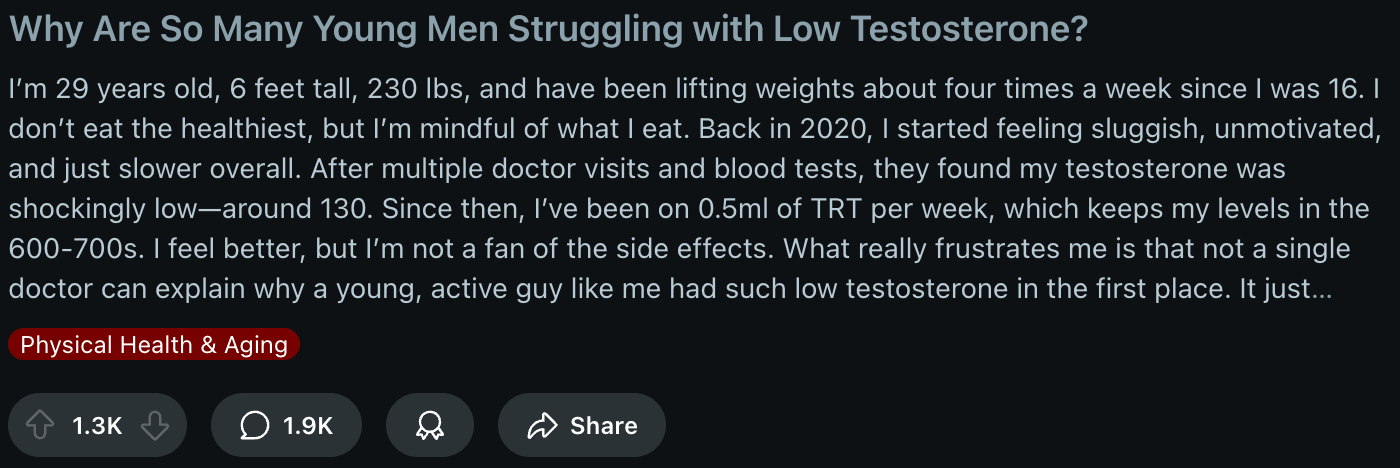 The Reddit post below is just one of many of young men reporting their struggles with low testosterone.