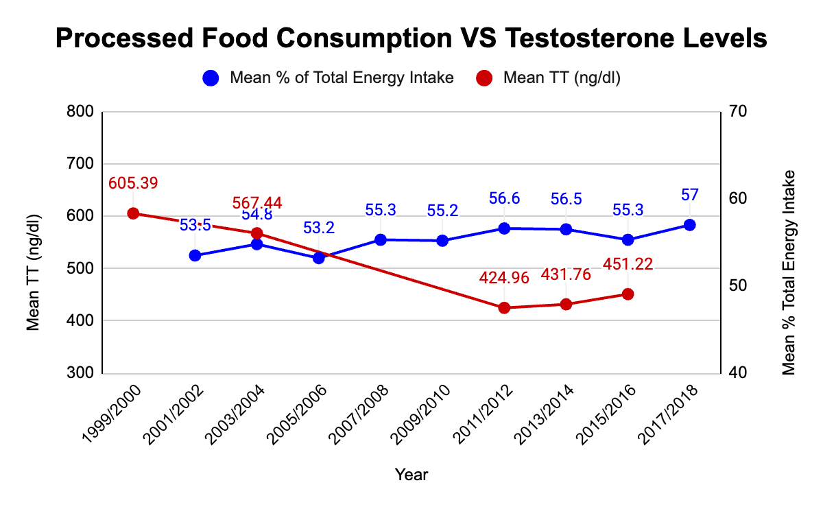 Based on the data and what I’ve personally witnessed, I’m of the conviction that increased processed food consumption is one of the leading causes of testosterone decline.