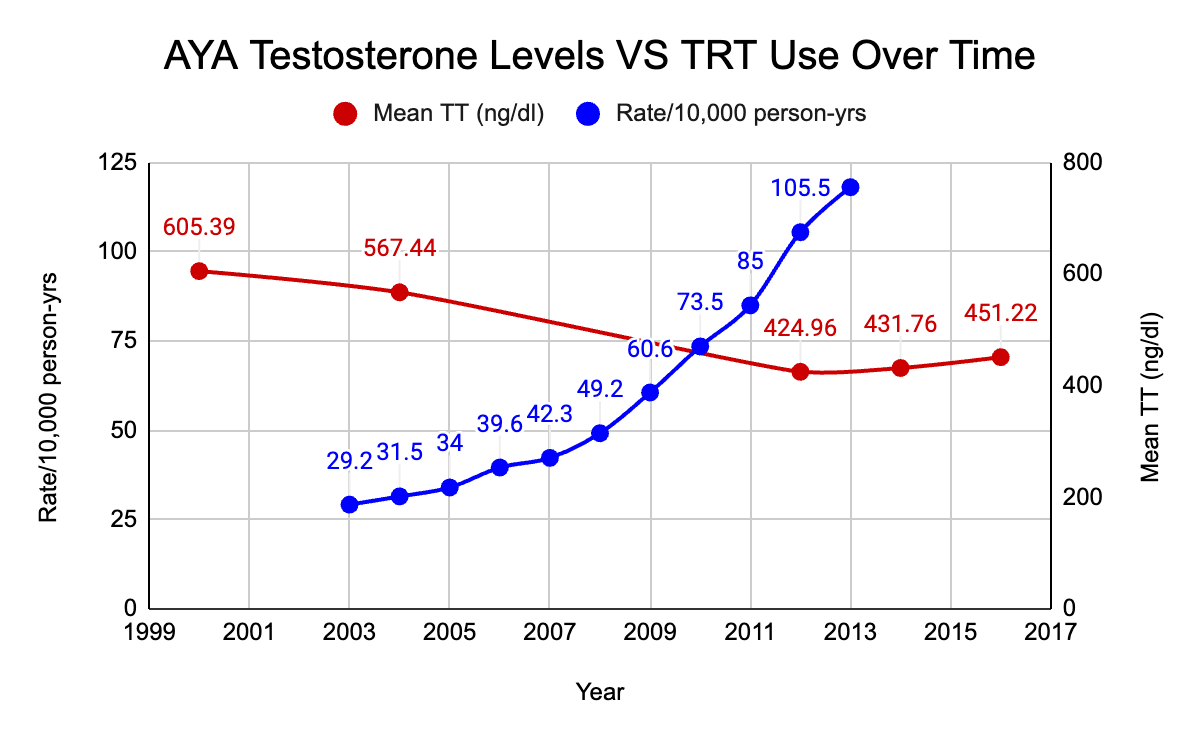 A 2016 study found that the rate of Testosterone Replacement Therapy (TRT) use among 18 to 45-year-old men quadrupled between 2003-2013 (16).