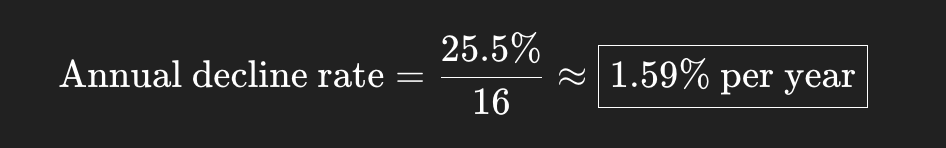 This works out to an average decline of about 1.59% per year.